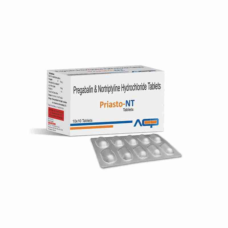 Detail:-Priasto‑NT Tablet contains Pregabalin 75 mg and Nortriptyline 10 mg for effective neuropathic pain relief and nerve support.