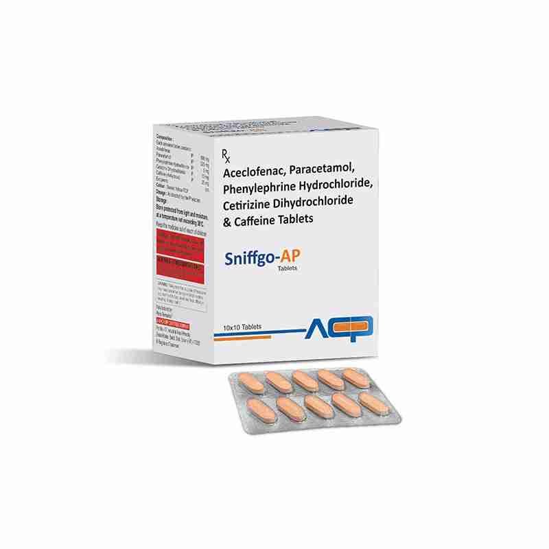 Detail:-Sniffgo AP Tablet combines Aceclofenac, Paracetamol, Phenylephrine, Cetirizine & Caffeine to help relieve common cold, allergy, congestion, pain & fever symptoms